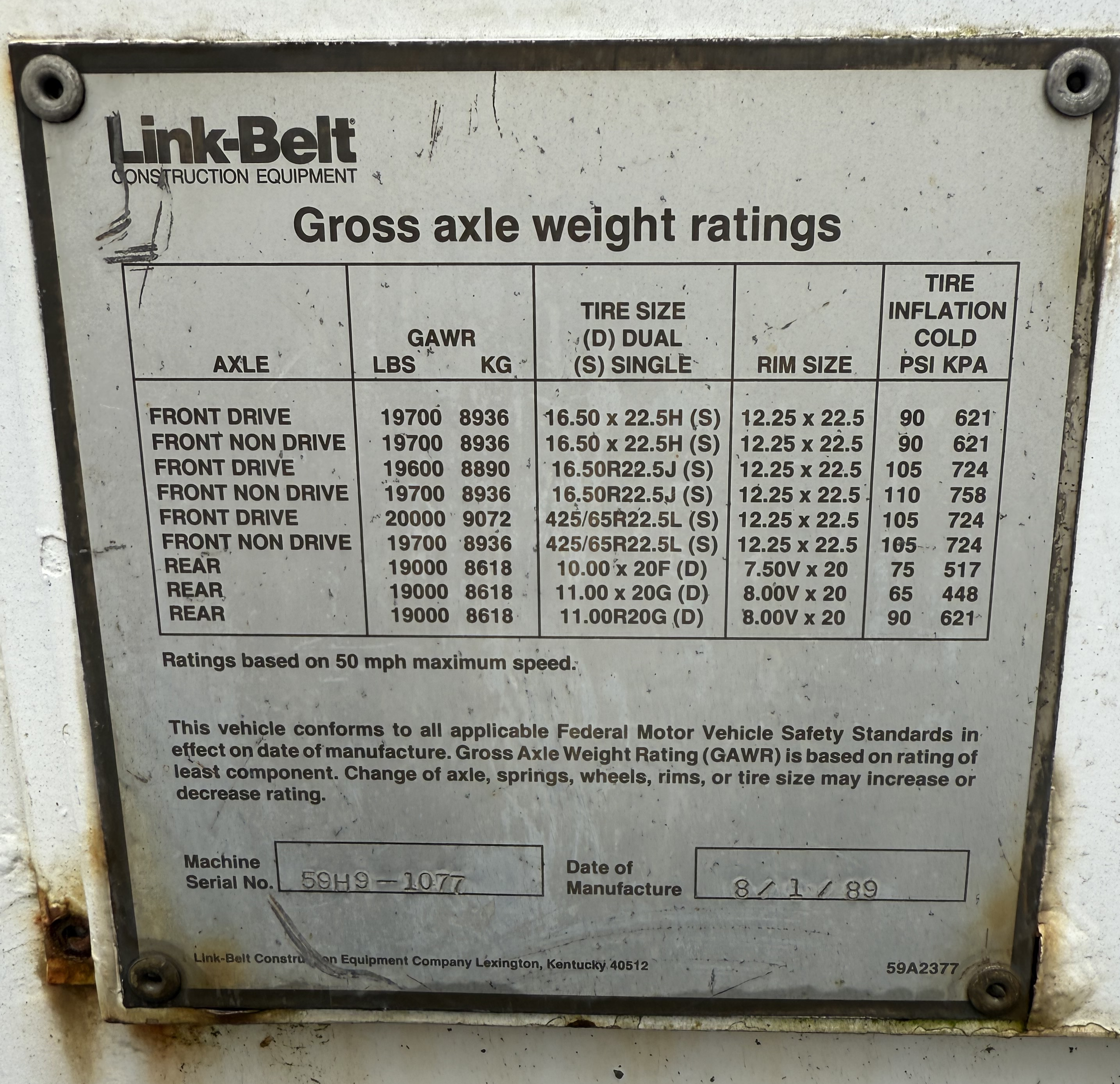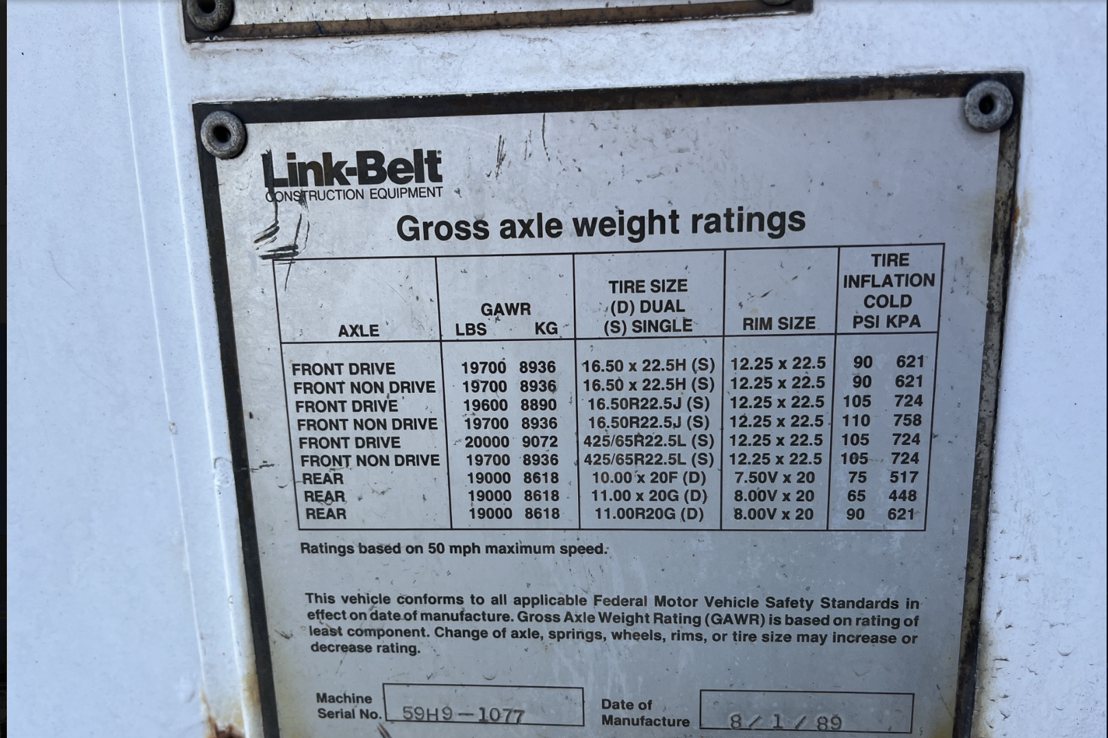 Front Tires: 16.5 x 22.5 (16 PR) transport type tubeless,