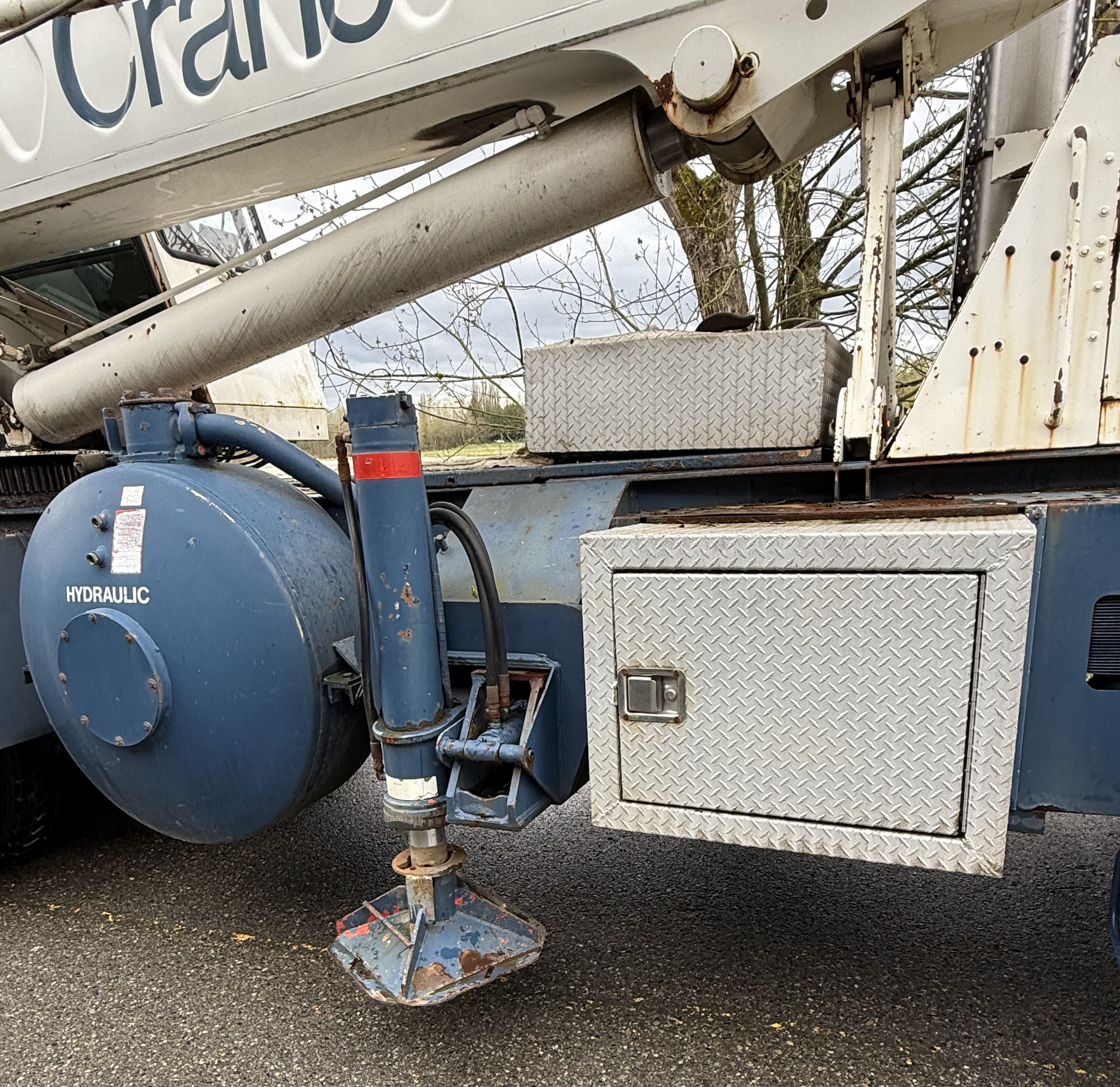 Power hydraulic, double box, single beam outriggers, front and rear. Vertical jack cylinders, each equipped with integral holding valve. Beams extend to 18' centerline-to-centerline and retract to within 8' overall width. Equipped with stowable 19" square lightweight floats. Controls and sight level bubble located in upperstructure cab,