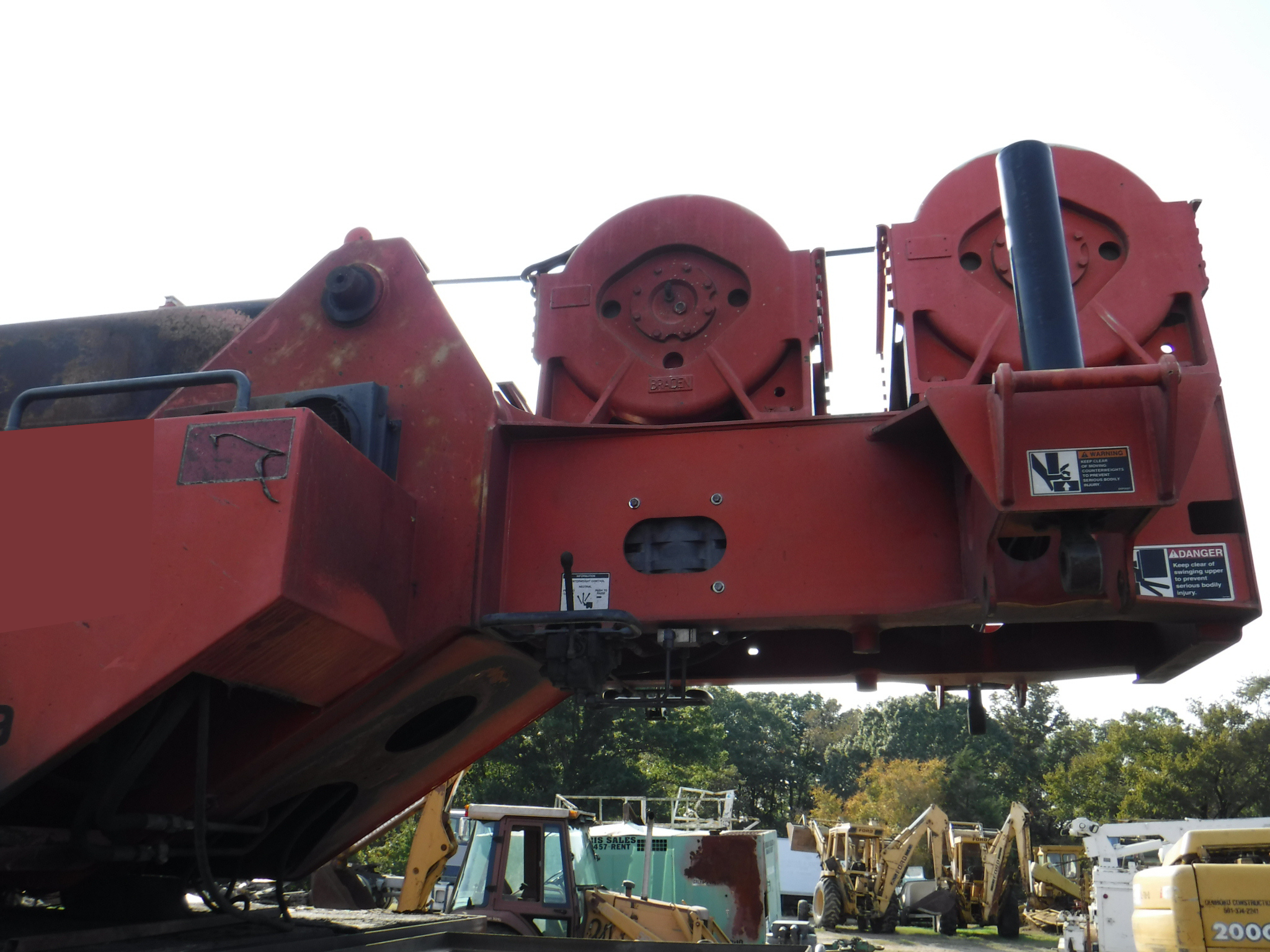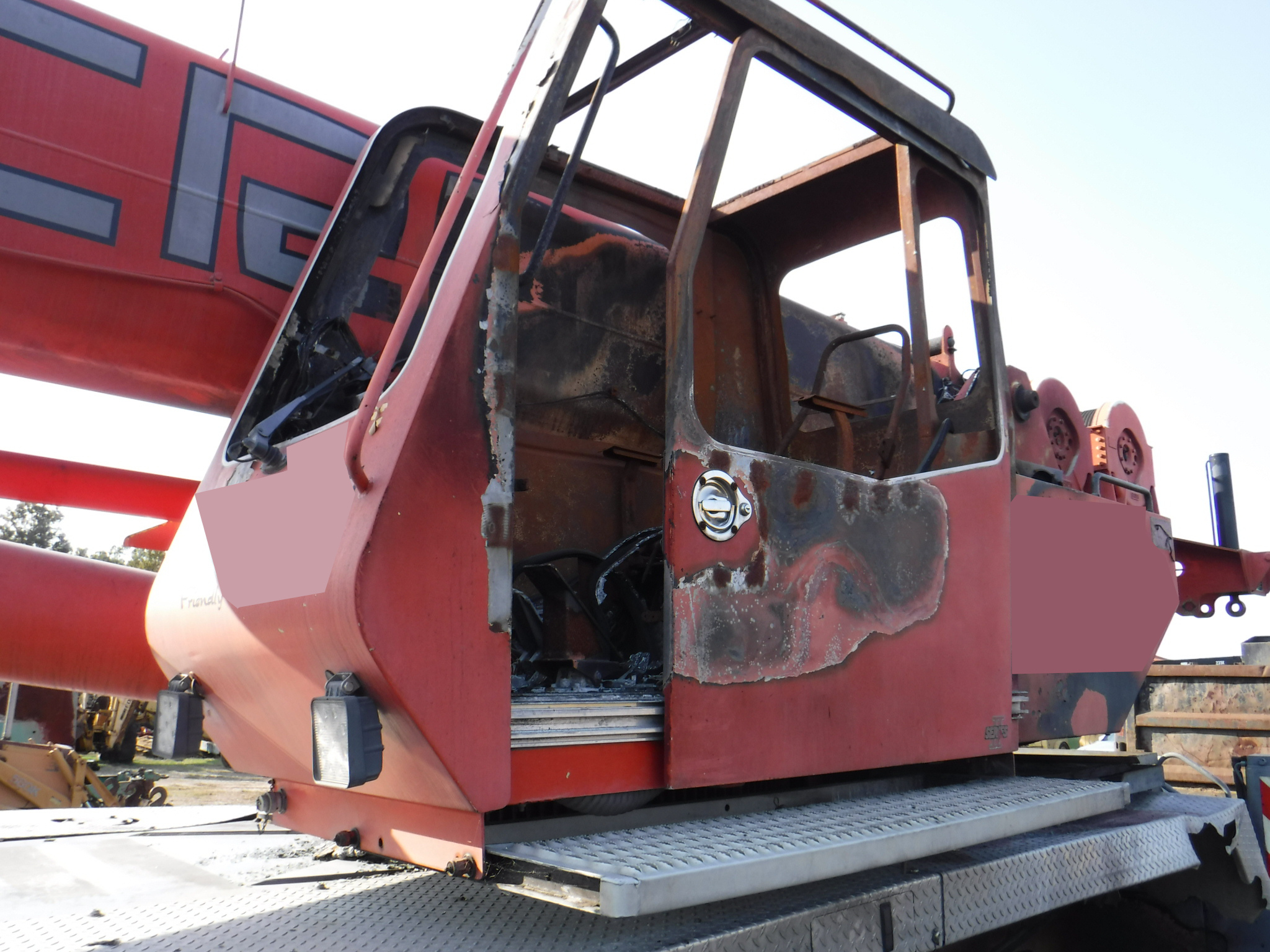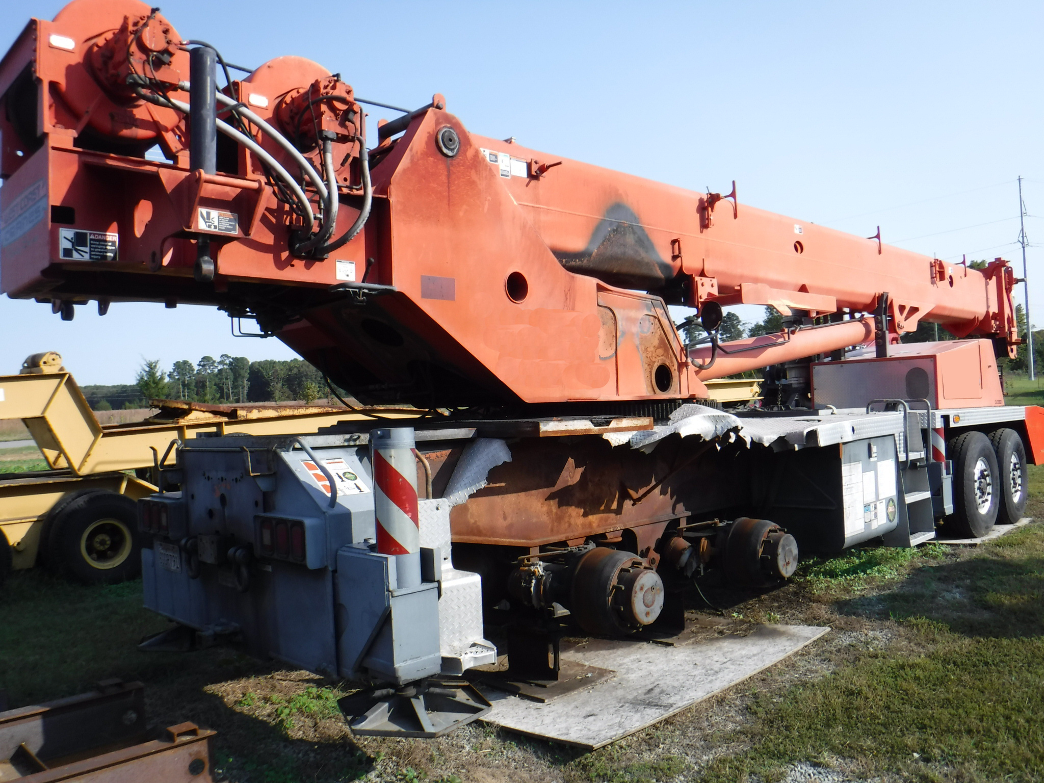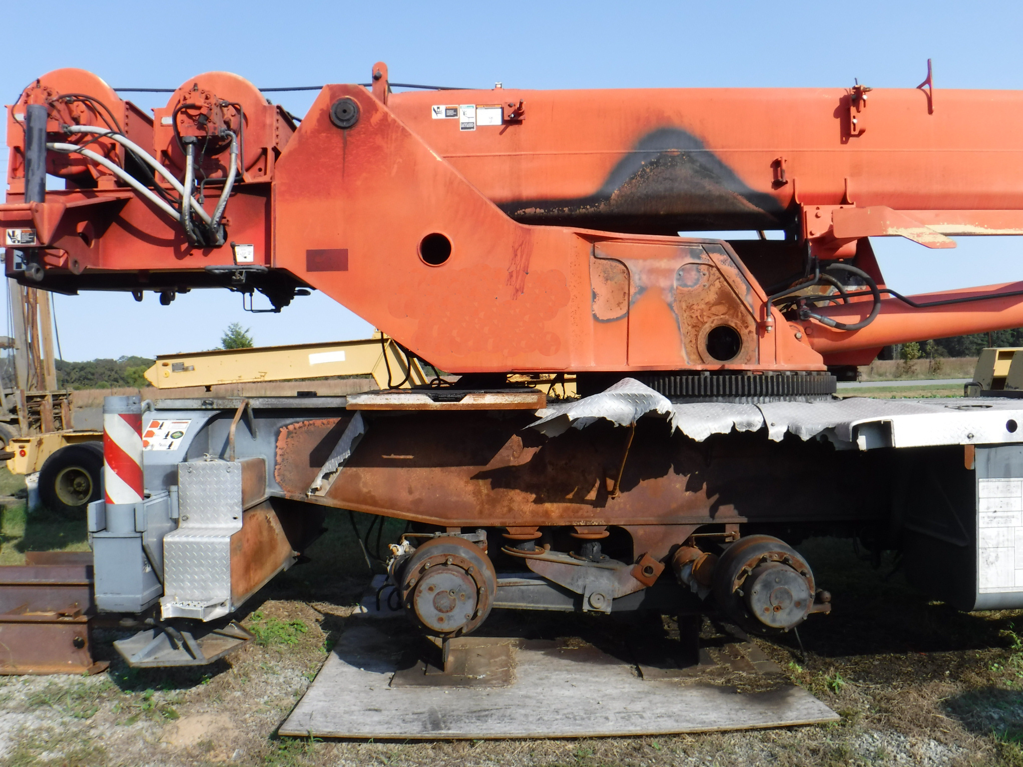 This crane was involved in a brake fire in the rear over the tandems. The fire reached the operator's cab and extended forward somewhat. The carrier cab appears to be pretty much intact. The boom, jib and counterweights are all unscathed,