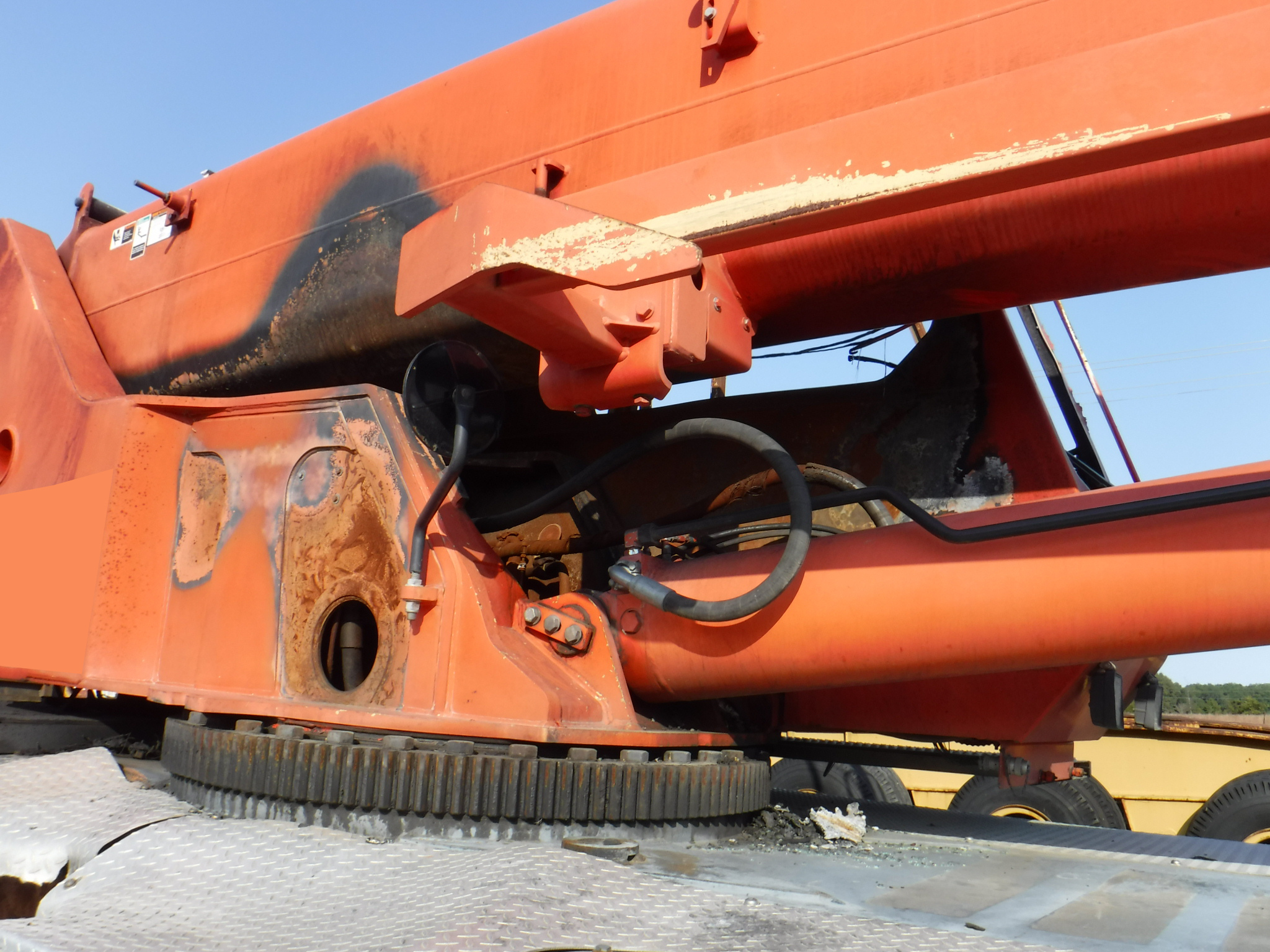 This crane was involved in a brake fire in the rear over the tandems. The fire reached the operator's cab and extended forward somewhat. The carrier cab appears to be pretty much intact. The boom shows fire exposure but is reported to be fully functional. The jib and counterweights are unscathed,