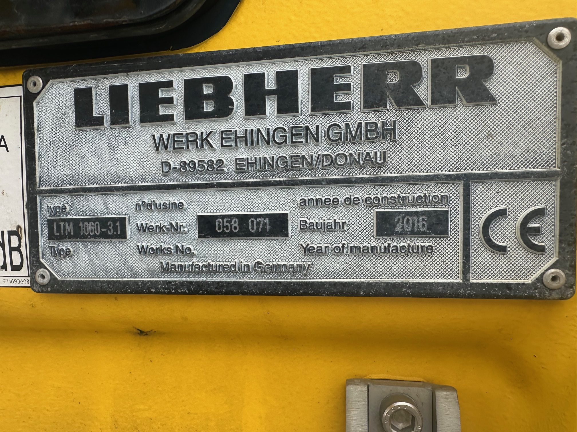 The Most Informative Listings On The Web CranesList Comprehensive Crane Listing 2018 Liebherr LTM1060-3.1 Ready to Go to Work! $599,900 CranesList ID: 1054 All Information Provided By The Seller Crane Specifications Overview Year: 2018 Make: Liebherr Model: LTM1060-3.1 Crane Type: All Terrain Serial: 058 071 Tons: 70 Weight: 79,400# Location: Texas Price: $599,900 CranesList ID: 1054 Good Condition OSHA Certified Notes 33.79' – 157’ Six Section 1 base section and 5 telescopic sections with rooster sheave, 31' - 52' Double Swing Away Jib mountable to the telescopic boom off-settable at 0, 20 or 40 degrees, Main Auxiliary Winches with 15mm wire rope, Licon2 Safe Load Indicator System, 28,200# Counterweights, 360° continuous rotation, 4.5-Ton Headache Ball, 33-Ton Hook Block, Crane Cab: Large Screen Area, Compound glass, Comfort Furnishing, 20 degrees tiltable to the rear, 8’ 4" wide Liebherr 6 x 6 Drive Carrier VIN Vehicle Identification Number: VIN # WLFA32B25GE220072, Liebherr Diesel Engine - SUBJECT TO FINAL CONFIRMATON, Telma Brake, Automated 12 Speed Manual Gearbox with oil cooled multi-disk clutch Transmission. Single Stage Transfer case with lockable transfer differential, Front and Rear Tires: 445/95 R25 (16.00 R25), Air Conditioning and Heater UP and Down, Current 3rd Party Certification. Location Texas Crane Details Boom/Jib Boom/Jib Images Boom: Boom: 33.79' – 157’ Six Section 1 base section and 5 telescopic sections157' Boom Length: 157' Jib: Jib: 31' - 52' Double Swing Away Jib Jib Length: 52' Boom/Jib Notes: 33.79' – 157’ Six Section 1 base section and 5 telescopic sections with rooster sheave, 31' - 52' Double Swing Away Jib mountable to the telescopic boom off-settable at 0, 20 or 40 degrees. Carrier Carrier images Carrier: 8’ 4" wide Liebherr 6 x 6 Drive Carrier Mileage: 59,140 Kilometers as of 2.2026 Carrier Notes: 8’ 4" wide Liebherr 6 x 6 Drive Carrier VIN Vehicle Identification Number: VIN # WLFA32B25GE220072, Liebherr Diesel Engine - SUBJECT TO FINAL CONFIRMATON, Telma Brake, Automated 12 Speed Manual Gearbox with oil cooled multi-disk clutch Transmission. Single Stage Transfer case with lockable transfer differential, Front and Rear Tires: 445/95 R25 (16.00 R25), Air Conditioning and Heater UP and Down, Lifting System Lifting System Images Hours: 3,511 Down and 7,464 Upper as of 2.2026 Winches: Main Winch, Auxiliary Winch Lifting System Notes: Main Auxiliary Winches with 15mm wire rope, Licon2 Safe Load Indicator System. Hook Block/Hook Ball Hook Block/Hook Ball Images Hook Block/Hook Ball: Hook Block, Hook Ball Hook Block/Hook Ball Notes: 4.5-Ton Headache Ball, 33-Ton Hook Block. Downloadable Files Associated with this Crane Documents Documents liebherr-ltm1060-31-specificationsand-charts.pdf (4.41 MB) , liebherr-ltm1060-31-specificationsand-chartsa.pdf (2.21 MB) Links OSHA Safety Regulations For Cranes In Construction Click To Enlarge or Browse All Images Click To Enlarge or Browse , , , , , , , , , , , We Welcome Your Calls and Emails! Contact Us Call +1-562-743-2338 contact@craneslist.com Jeffery LomasCustomer Service Call: +1 (562) 743-2338 Email: jeff@craneslist.com José Issac JocolLatin America Rep Call: +011-502-3009-8209 Email: jose@craneslist.com Matthew HuertaCEO Call: +1 (562) 743-2338 Email: matthew@craneslist.com